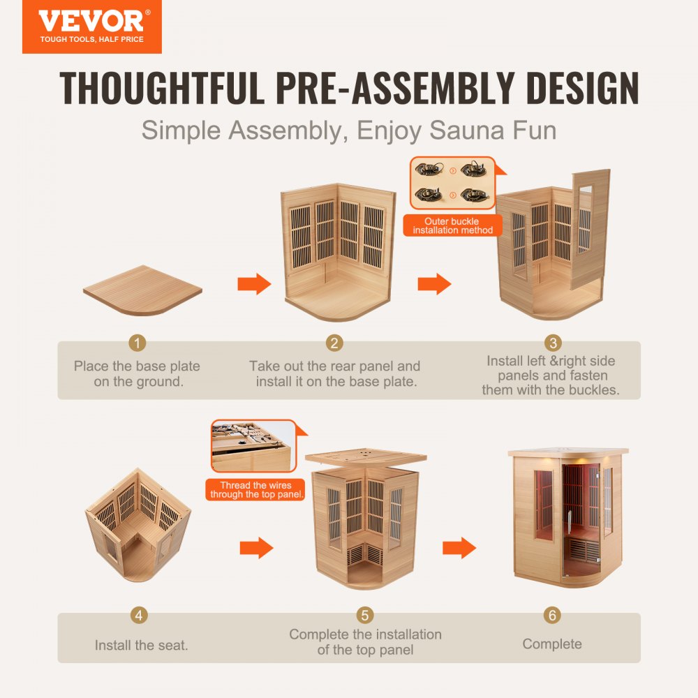Konstrukcja wstępnie zmontowana: Sauna jest wstępnie zmontowana i wymaga jedynie montażu po otrzymaniu. W zestawie znajdują się przejrzyste instrukcje montażu i schematy okablowania, dzięki czemu nie musisz martwić się skomplikowanymi połączeniami śrubowymi.