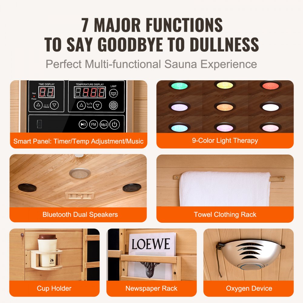 Drewniana sauna na podczerwień, sauna spa do domu, dla 2 osób, sauna na podczerwień o niskim polu elektromagnetycznym, drzwi ze szkła hartowanego, wielokolorowa lampa LED i głośniki Bluetooth, 2 kW do użytku wewnątrz pomieszczeń - Zdrowie i dobre samopoczucie