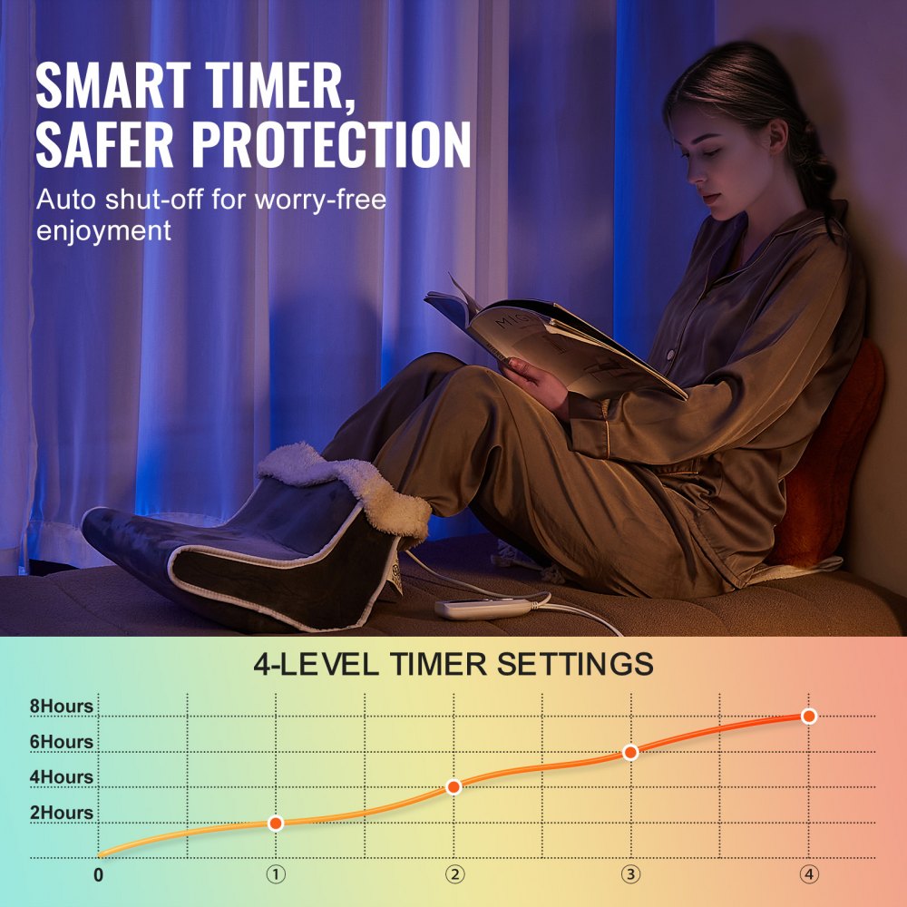Zwiększone bezpieczeństwo: Elektryczny ogrzewacz stóp z automatycznym wyłączaniem wyposażony jest w 4-stopniowy, inteligentny timer (2, 4, 6 lub 8 godzin), który zapobiega nadmiernemu użytkowaniu lub zapomnieniu o wyłączeniu. Dodatkowo, wbudowane zabezpieczenie przed przegrzaniem pozwala cieszyć się przytulnym ciepłem ze spokojem.