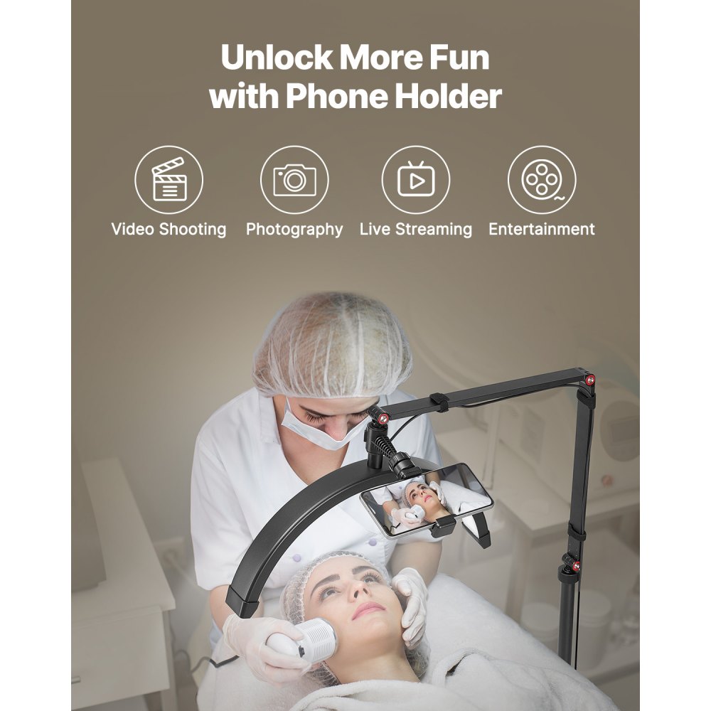 Half Moon Light 2 w 1 lampa podłogowa LED, lampa biurkowa, lampa do przedłużania rzęs, lampa do rzęs ze stojakiem na telefon, dla wizażystów, salonów kosmetycznych, pielęgnacji skóry, kolor czarny