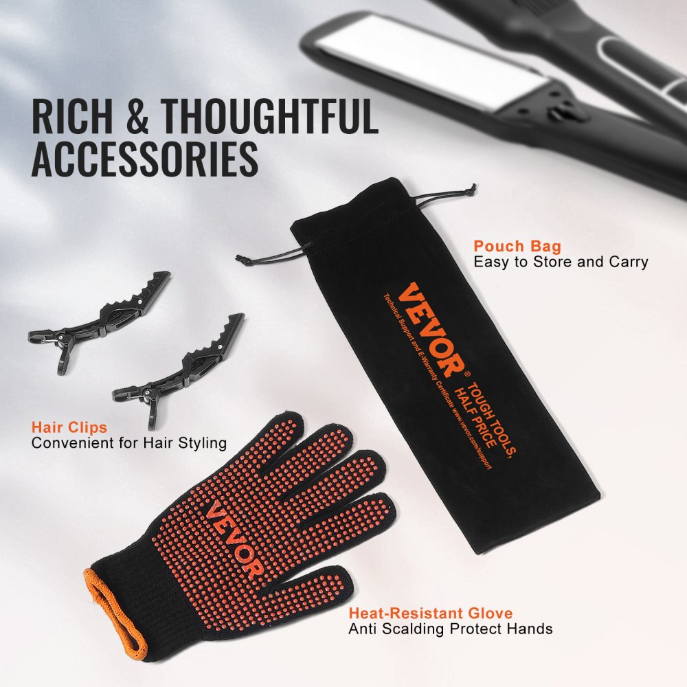 Przemyślane akcesoria: Dołączone spinki do włosów pewnie trzymają włosy na miejscu, umożliwiając szybką i skuteczną stylizację, a rękawica odporna na ciepło zapewnia dodatkową ochronę dłoni. Dodatkowo, aksamitne etui umożliwia wygodne przechowywanie i transport, dzięki czemu możesz zabrać prostownicę wszędzie.