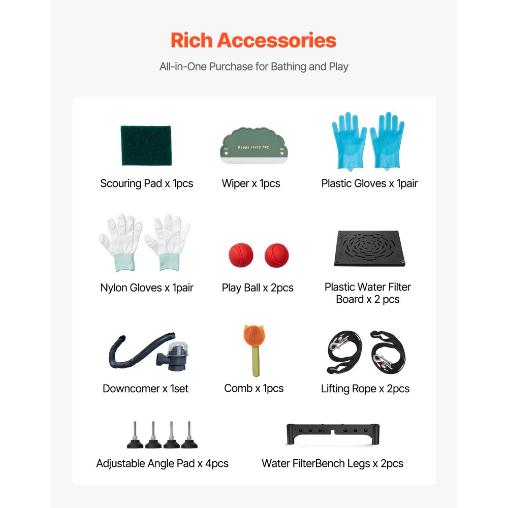 Pełne wyposażenie: Miska dla zwierząt jest wyposażona w słuchawkę prysznicową, kran i bezpośrednie podłączenie do domowego węża, co zapewnia długą żywotność. W zestawie znajdują się także chusteczki czyszczące, ściągaczka, piłki do zabawy, szczotka i rękawiczki, aby Twój pupil mógł w pełni cieszyć się kąpielą.