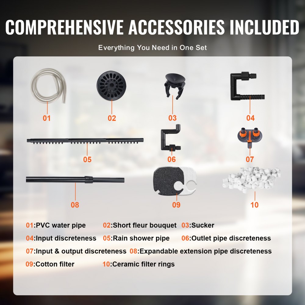Wydajna filtracja: Wbudowana pompa o maksymalnym przepływie 172 GPH (650 l/h) przy mocy 8 W, zalecana do stosowania w 30-galonowych akwariach słodkowodnych, zbiornikach dla żółwi i zbiornikach dla ryb. Woda przepływa przez warstwy filtra, filtrując ją i utrzymując w czystości. Każda warstwa jest wyposażona w gąbkę, która ją utrzymuje, i jest wyposażona w ceramiczne pierścienie oraz kule biologiczne.