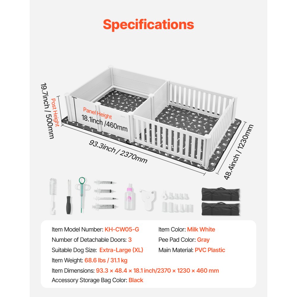 Kojec dla szczeniąt, 237 x 123 x 46 cm, plastikowy kojec z PVC z drzwiczkami o regulowanej wysokości i zmywalną matą higieniczną, układ 2 pomieszczeń, klatka dla szczeniąt bardzo dużych psów, kolor mlecznobiały - Zwierzęta domowe