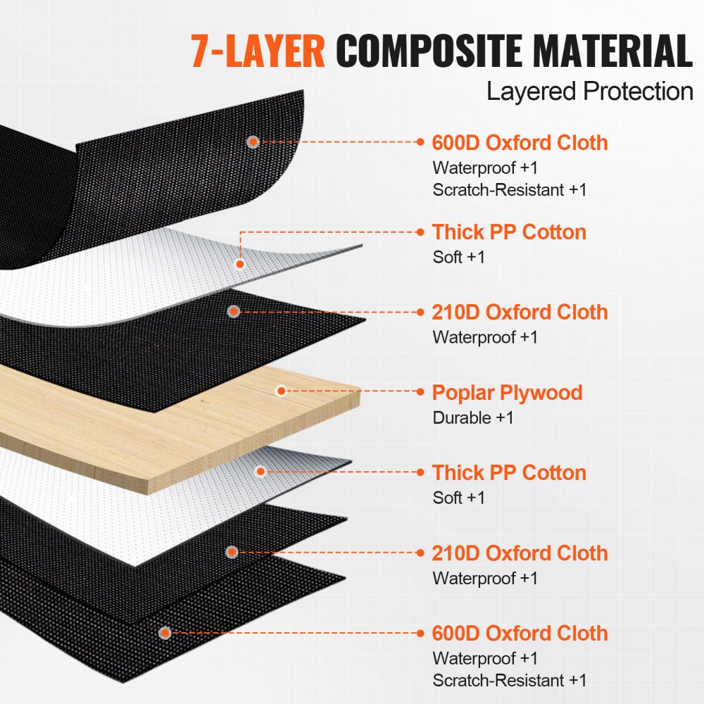 Wielomateriałowy: Wykonany z 7 warstw, z wodoodporną i odporną na zarysowania tkaniną na powierzchni i spodzie, zapewniającą stabilność. Wytrzymałe materiały są odporne na zużycie i uszkodzenia spowodowane pazurami psa, co wydłuża żywotność pokrowca.