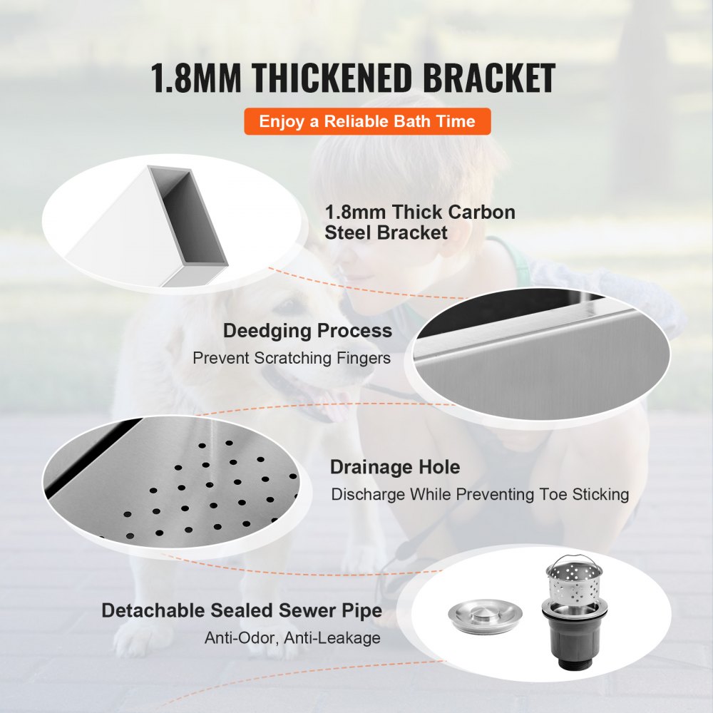 Wielofunkcyjne urządzenie typu „wszystko w jednym”: wyposażone w uniwersalną nasadkę prysznicową ze stali nierdzewnej z mydelniczką do przechowywania środków czystości dla zwierząt. Stop aluminium gwarantuje odporność na rdzę i korozję, zapewniając bezstresową kąpiel.