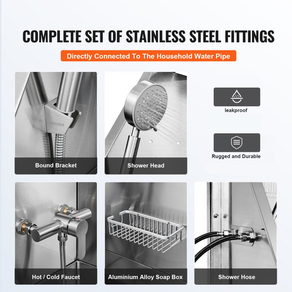 Akcesoria ze stali nierdzewnej: Wyposażone w głowicę prysznicową ze stali nierdzewnej, kran i ramę mocującą, która łączy się bezpośrednio z wężem ogrodowym. Są odporne na rdzę i trwałe. Dodatkowa mydelniczka ze stopu aluminium jest dołączona dla zapewnienia trwałości.