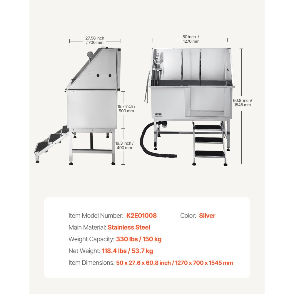 Stacja do mycia psów ze stali nierdzewnej, 1270x700x1545 mm, wanna do pielęgnacji zwierząt ze schodami, płyta filtrująca wodę z PE, kran, głowica prysznicowa i uchwyt na mydło, dla dużych, średnich i małych zwierząt (drzwi prawe)